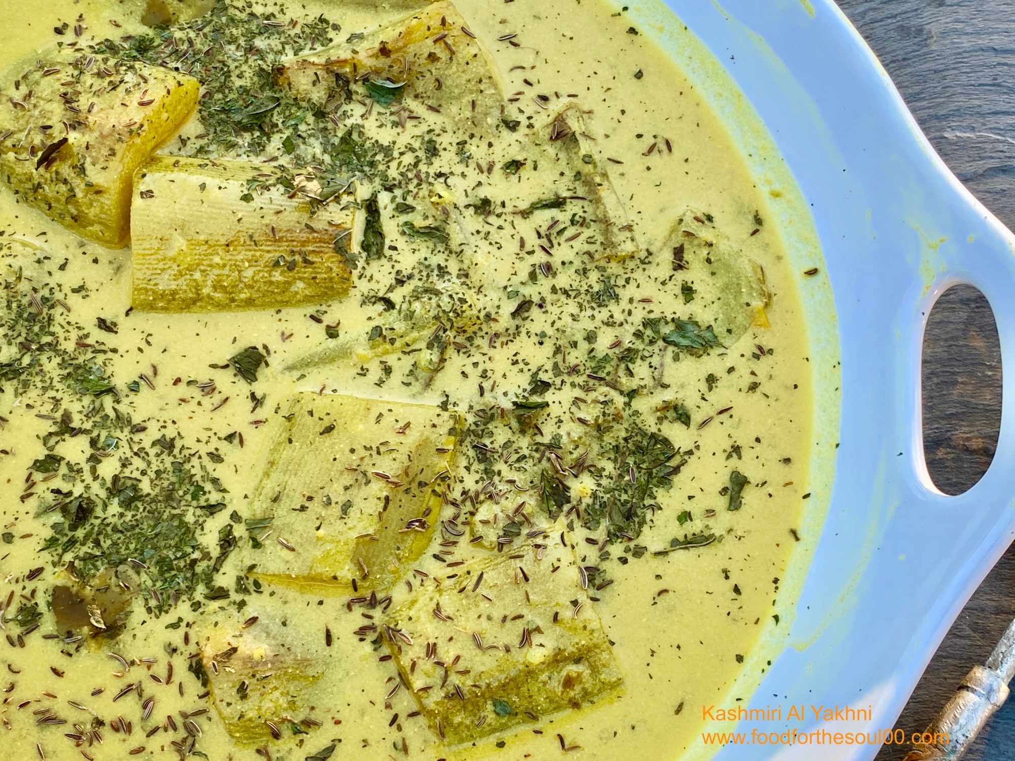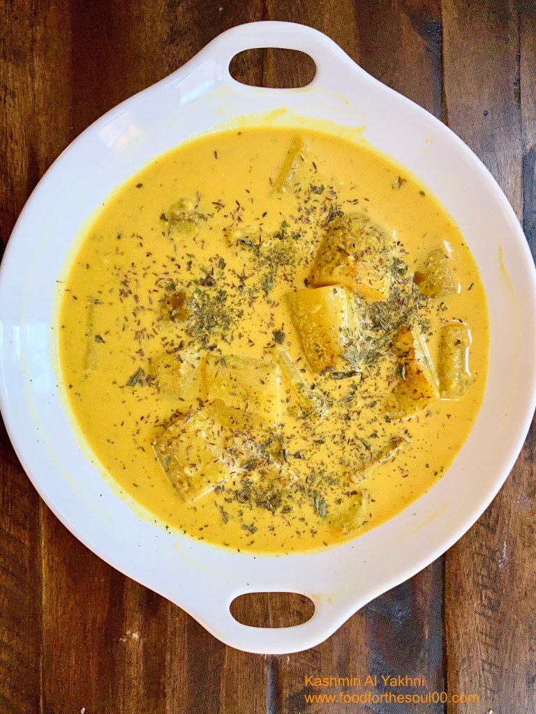 Yakhni denotes a yoghurt based sauce. This recipe for the bottle gourd is subtly spiced with fennel and dry ginger powder. This is a light recipe….not spicy and not greasy. You can however raise the taste by adding a bit of Ghee at the end. The turmeric will dictate the color so adjust accordingly.