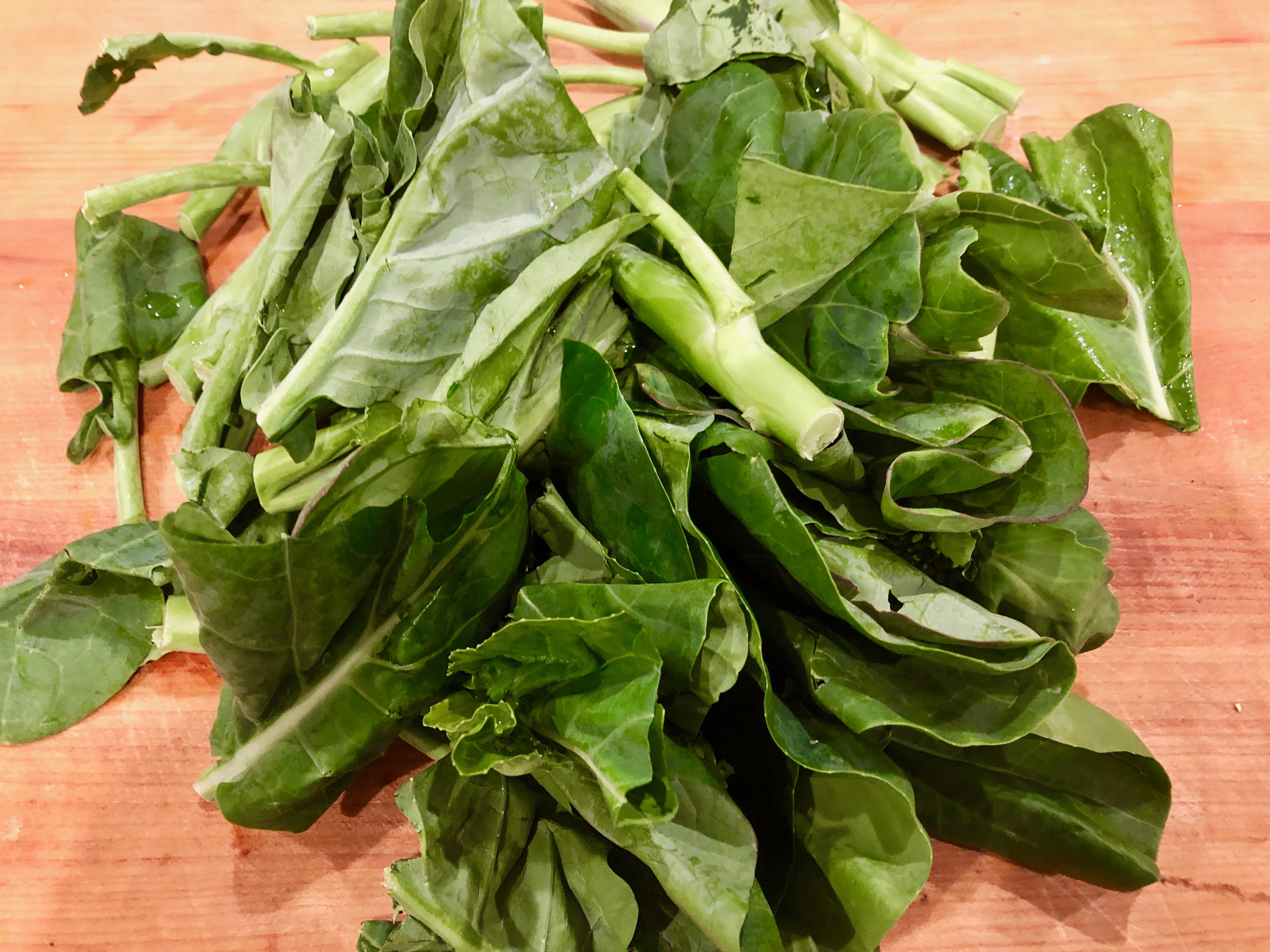 For the greens, I prefer the leaves called Chinese broccoli but collard green work really well too. Remove the leaves from the stems. If the stems are thick, peel the skin and use the inside, they are packed with flavor