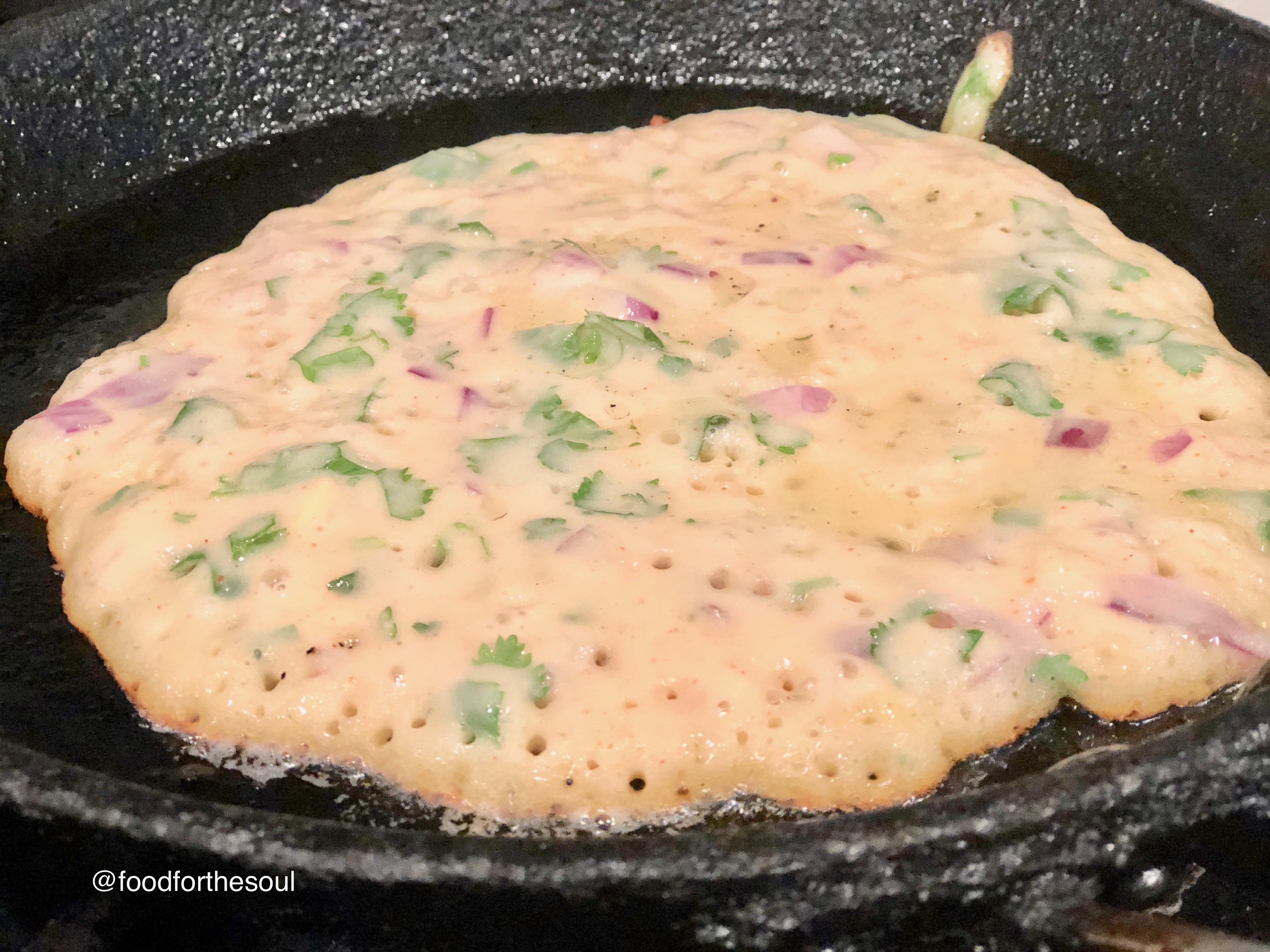 Once the batter is fermented, add the herbs and spices and use water to bring out the consistency of pancake batter.