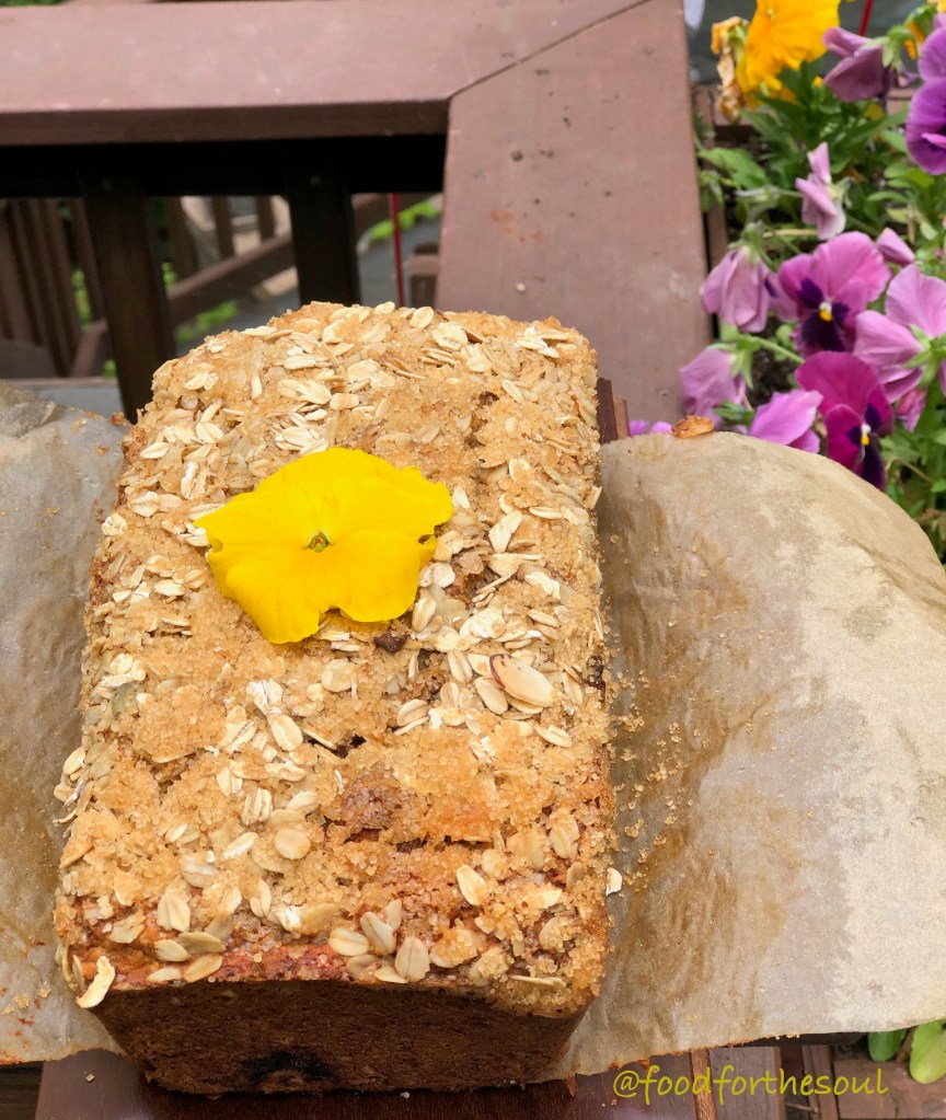 • Pour the batter in the pan and top with some oats and raw sugar ( regular or coconut)