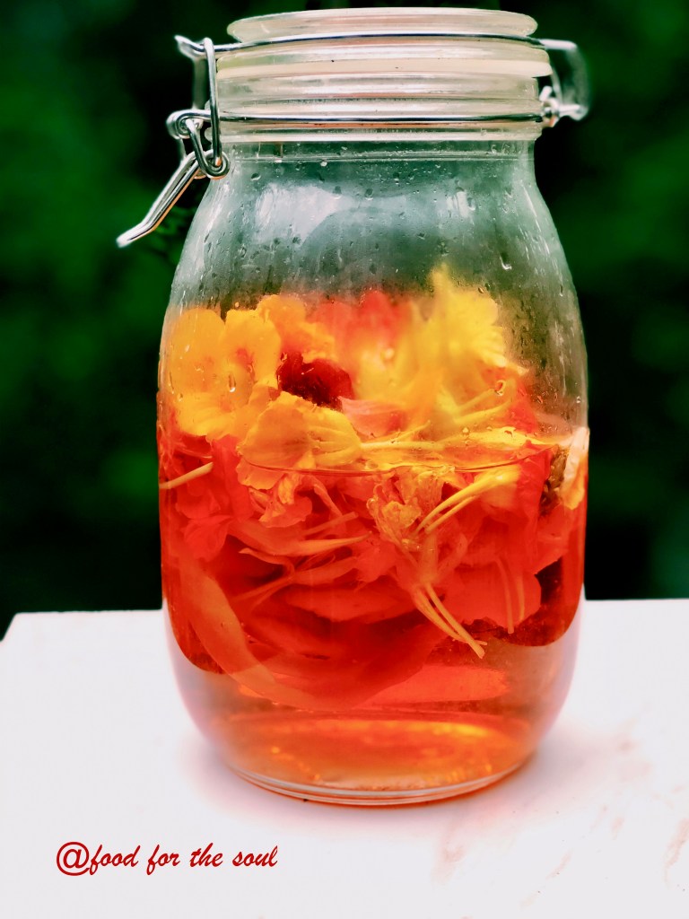With an abundance of flowers, I decided to make a simple Nasturtium flower infused vinegar. All it takes is flowers and a good quality organic white vinegar. It is really as simple as that, use as many flowers as you like but a recommendation is below.