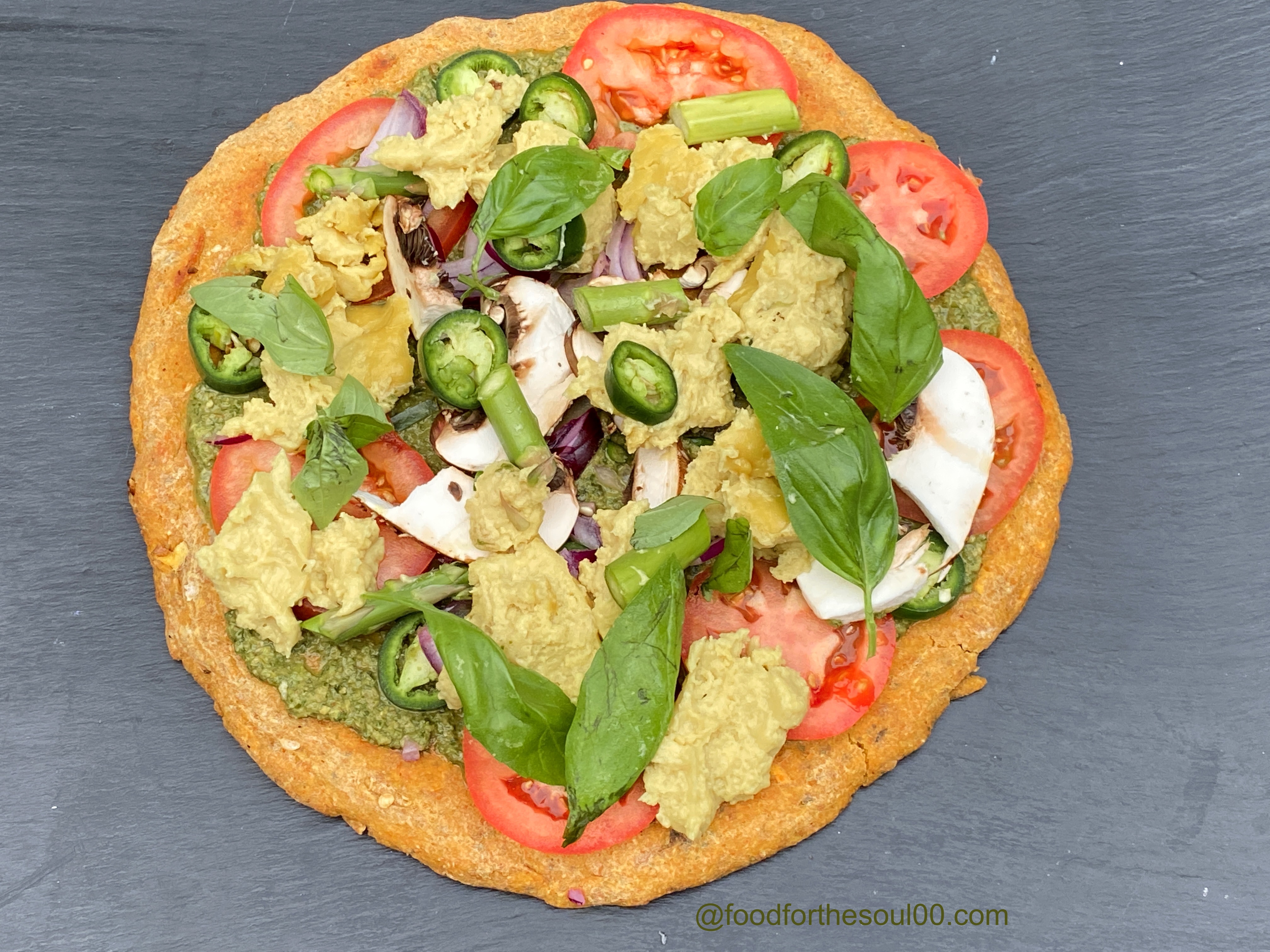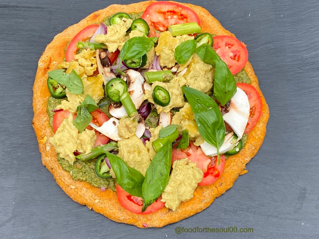 A nourishing and delicious plant based Pizza with a sweet potato crust