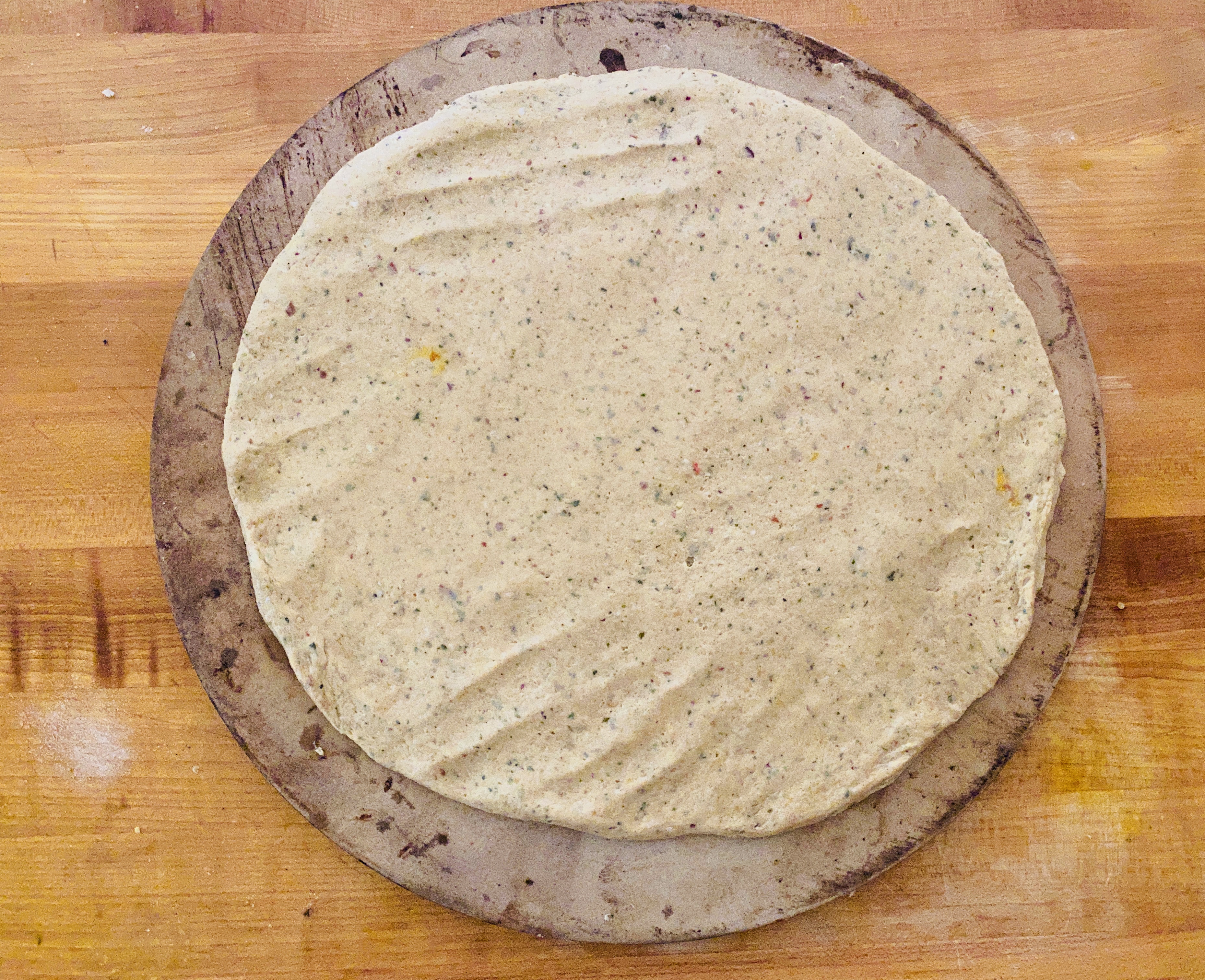 9. Using a Pizza stone or a parchment lined pan, start shaping the dough in a circular form about 1/4 inch thick. A little bit of olive oil on your hands may help and also helps to use it lightly on the pizza stone.