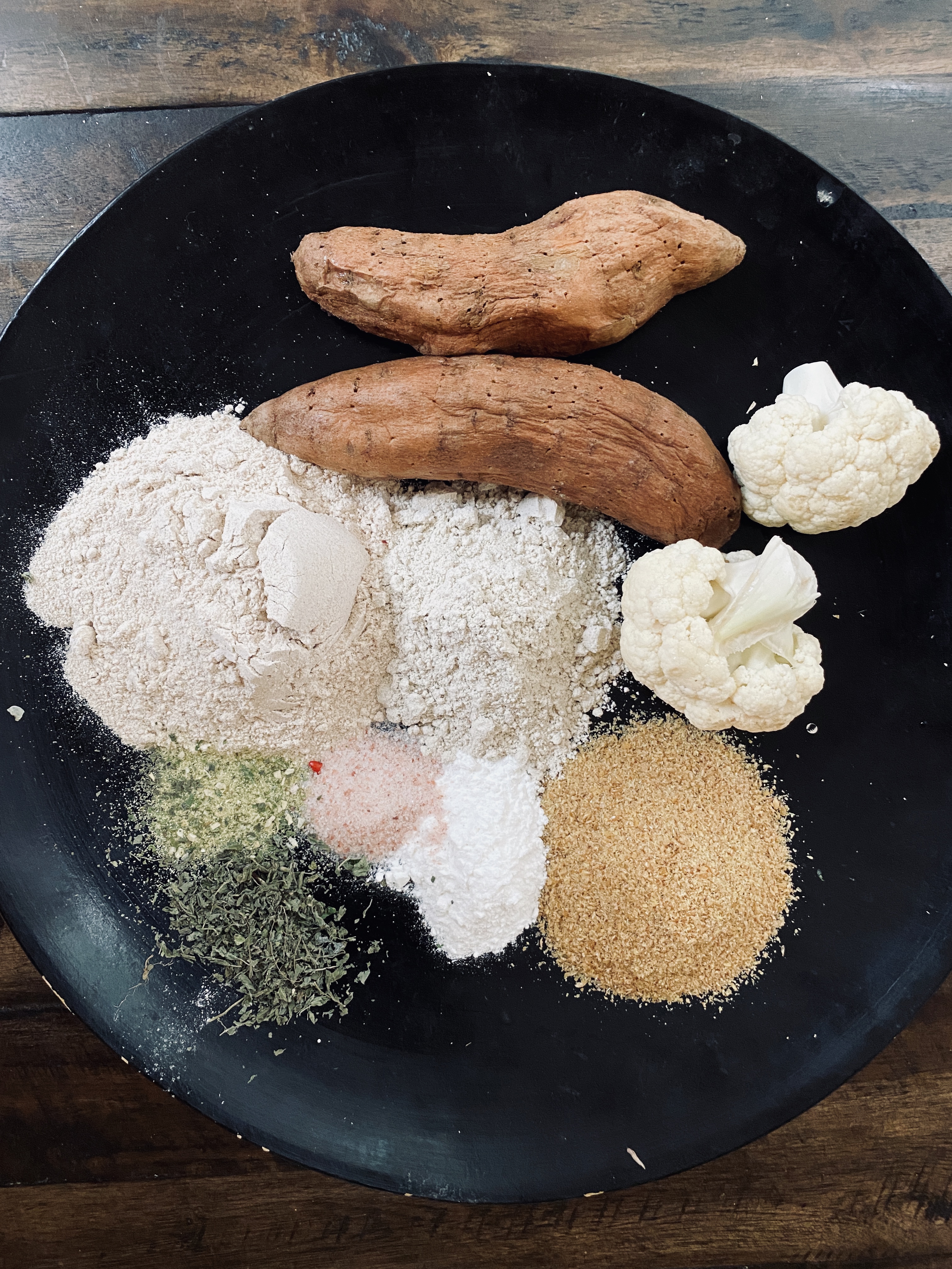 4. Using your food processor, add the cauliflower and grate it, add the roasted sweet potato ( you can use the skin too) and then add the soaked flax and pulse for a couple of rounds