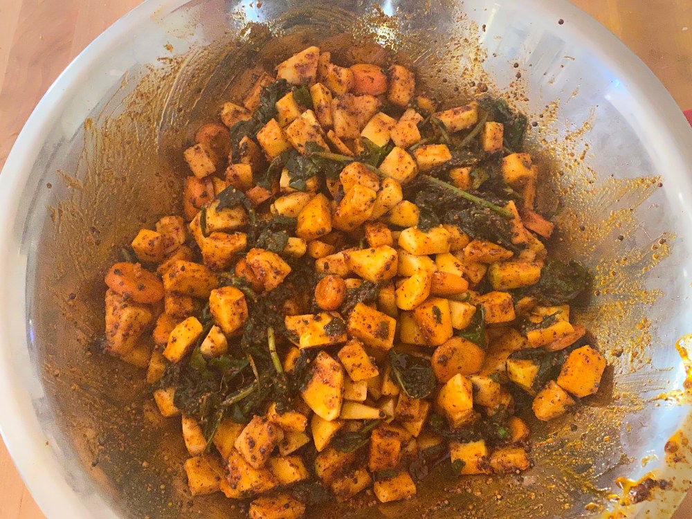 The basic recipe was for Monji Achar ( Kohlrabi pickle) from which I strayed a bit and added the crunchy turnips and carrots. The Kohlrabi leaves were also chopped and added them.