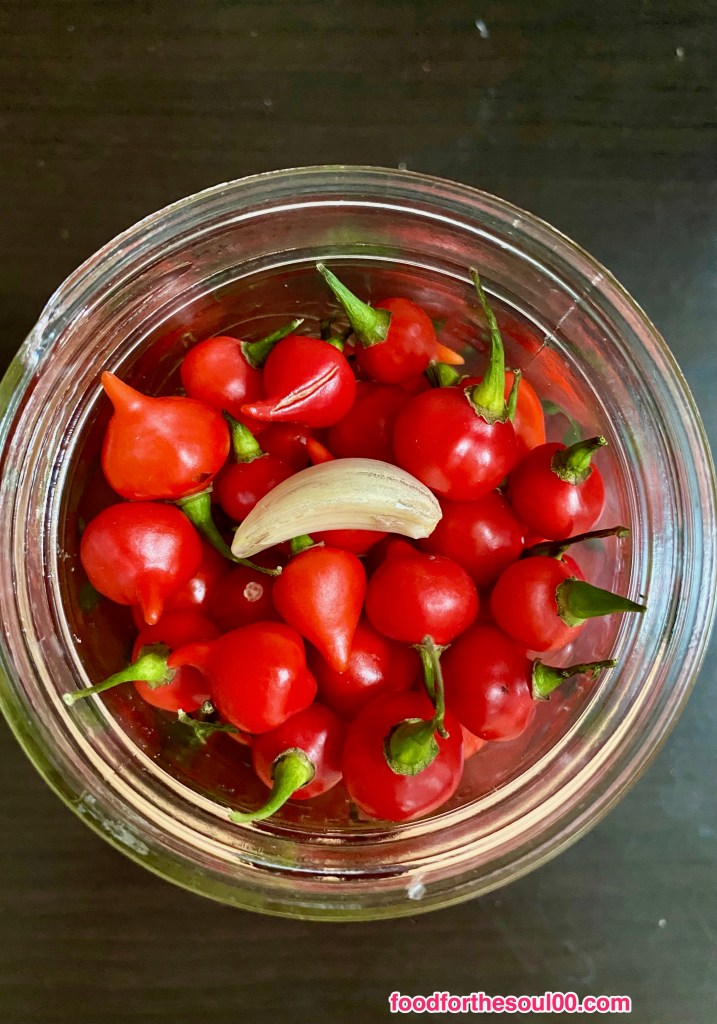 - In a clean sterilized mason jar add 2 cloves of garlic and the spices, add cleaned and washed peppers and top with the remaining garlic.