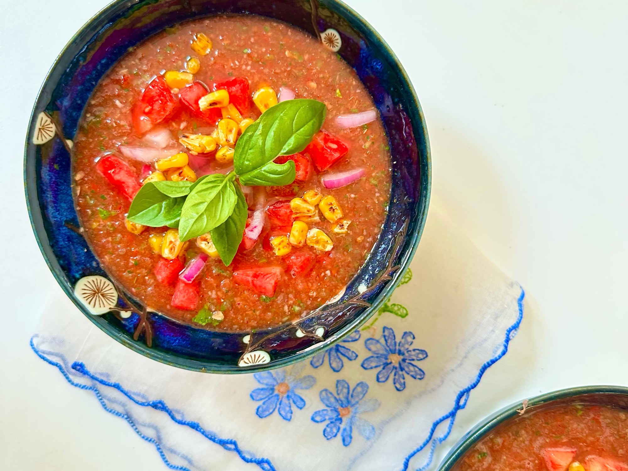 - Its ready! Top with roasted corn, herbs and chopped watermelon and serve this beautiful bowl of soup. You can also add some Avocado on top before serving
