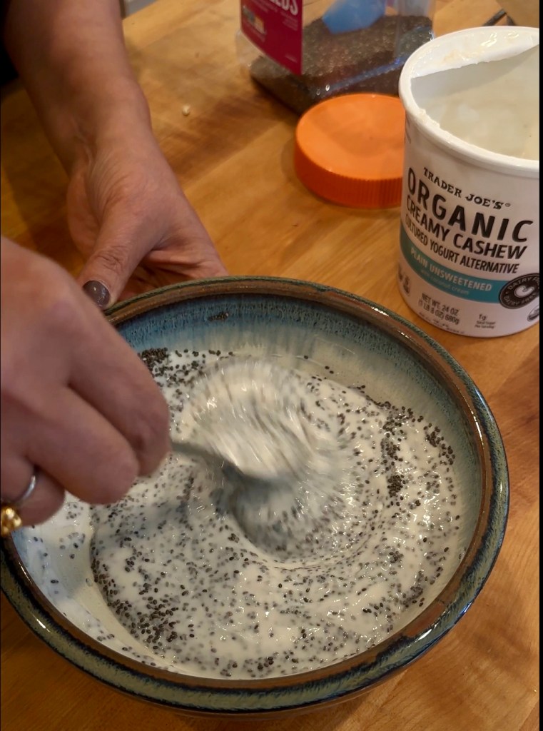 - Pour the plant yogurt in a bowl and add 2 heaping tablespoons of chia seeds. Mix well and leave in fridge for at least 20 mins ( I left it for a couple of hours)