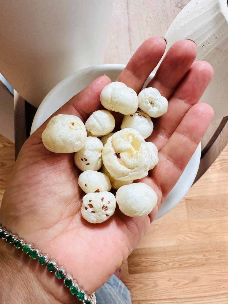 Now, the fox nuts, Makhana—a type of harvested seeds from the Euryale ferox plant. Makhanas are widely cultivated throughout Asia and are often used in traditional forms of medicine. I have added them for their nutrient value and the thickness they bring to the dish. They have been dry roasted on a medium flame so they crisp up.