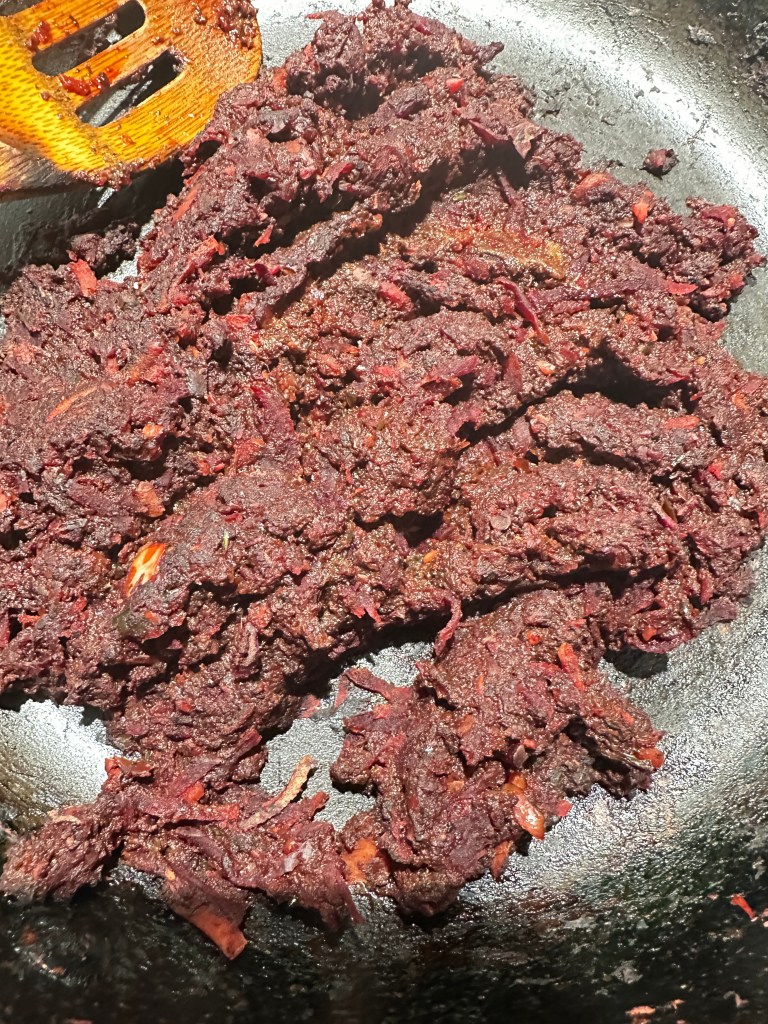 - Prep the ingredients: Grate the onion and squeeze out all the water. Clean and break the mushrooms apart. Use your food processor and pulse the mushrooms, chili and garlic until they break into smaller pieces (don’t mince completely at this stage). Cook the mushrooms in a large pan along with the grated beets until the moisture has evaporated considerably ( 7-8 mins)