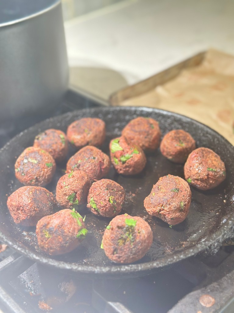 - Brown the koftas: Heat a drizzle of olive oil in a pan over medium heat. Cook the koftas for 2-3 minutes on each side until golden and crisp. Alternatively, bake them at 400°F (200°C) for 20 minutes, flipping halfway through.