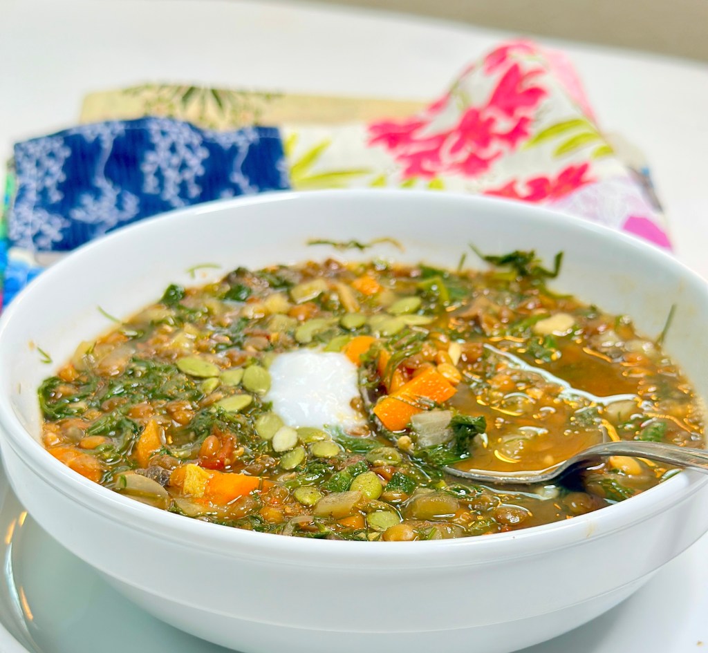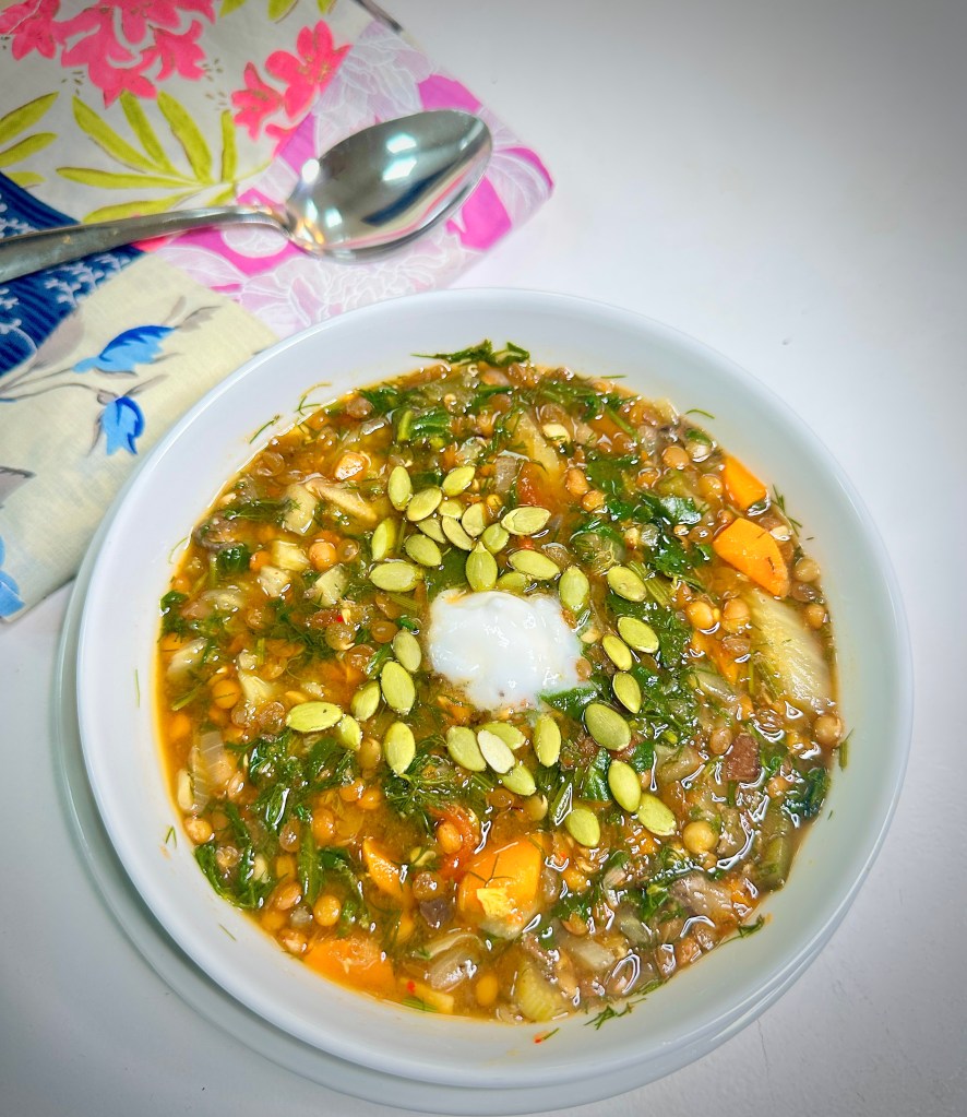 For me, soup is good any day, any month, and any season. But, just before the tender buds appear on trees, a slight chill in the air, overcast not yet spring days, soup fills your heart with the right warmth and heartiness. This lentil soup is packed with vegetables, green lentils, and herbs. It is simmered slowly to meld all the flavors—perfect for those days when you crave comfort in a bowl.