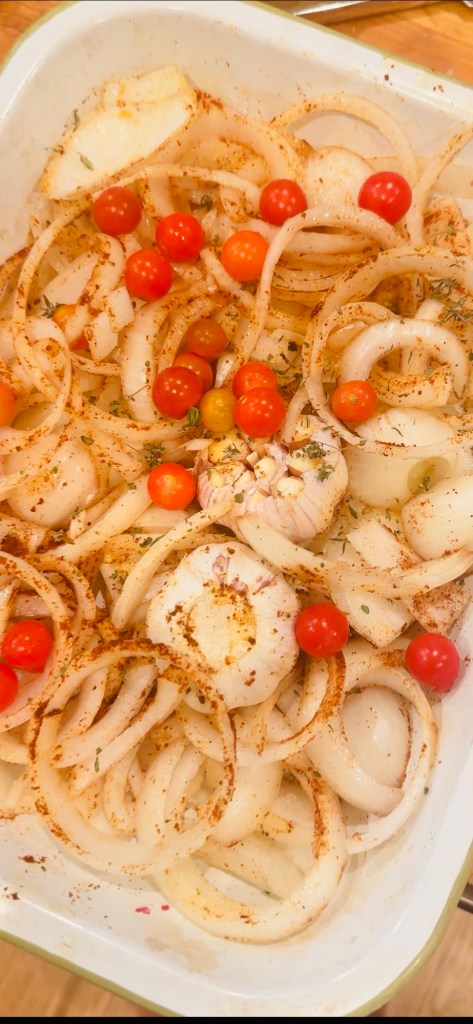 - Spread sliced onions on a baking sheet. Add a sprinkle of salt and paprika with some thyme and rosemary. Add the garlic pods and tomatoes and 1/2 cup of the broth. Cover with foil.