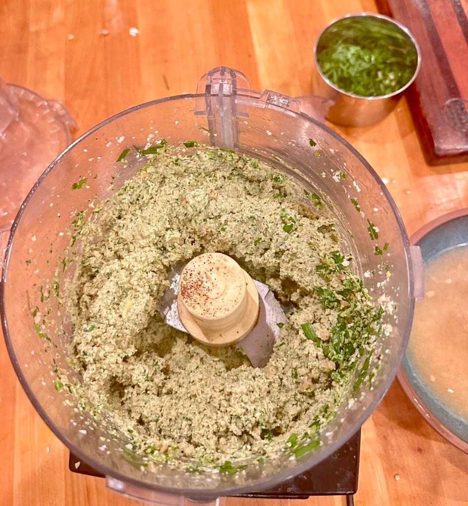 - In a food processor – add the cilantro, chives, green chilies and walnuts and pulse until they break down. Do not make a paste