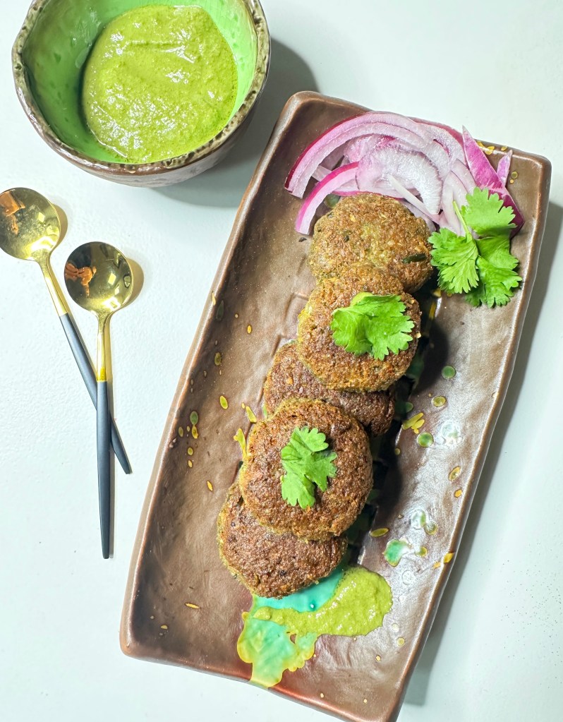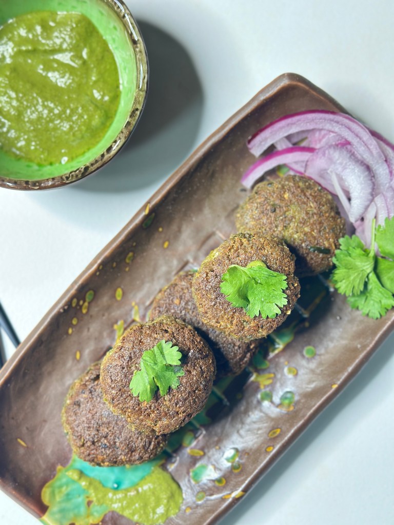 Imagine coriander, cumin, and black pepper. Add ginger, garlic, chives and fresh cilantro. These ingredients are blended with walnuts, TVP and tofu to form patties. They sizzle in the pan. A quick golden sear locks in the flavors. This makes them irresistible when paired with mint chutney. They are also delicious tucked into a wrap with pickled onion.