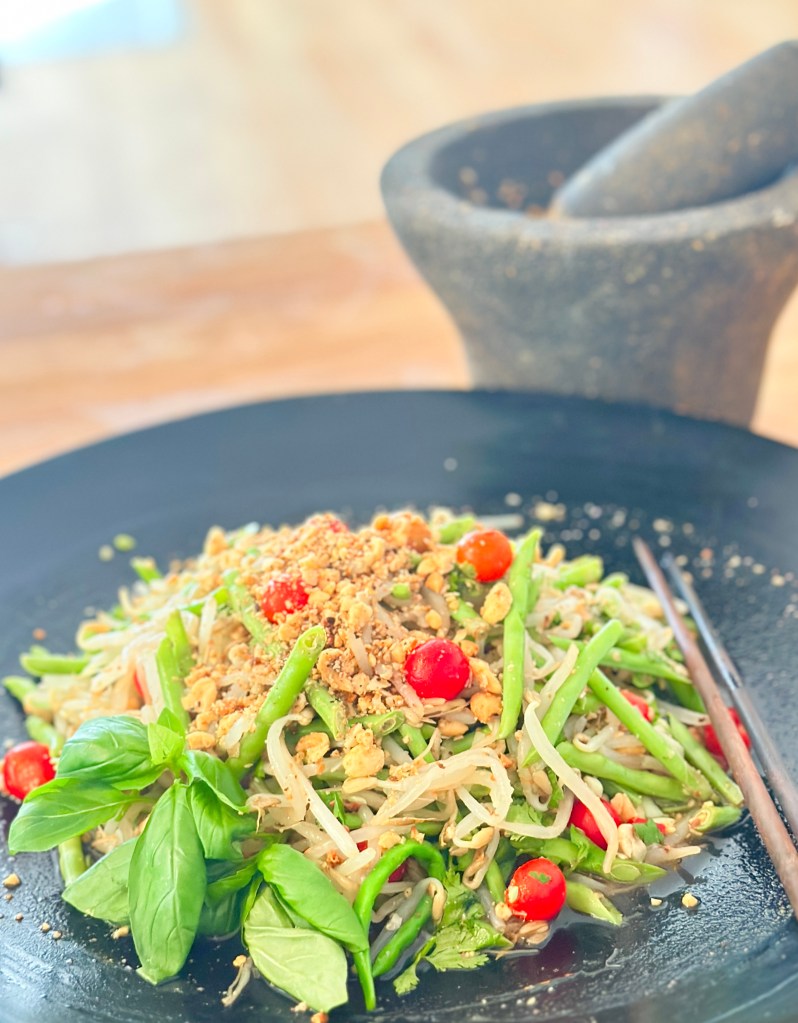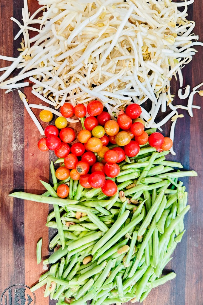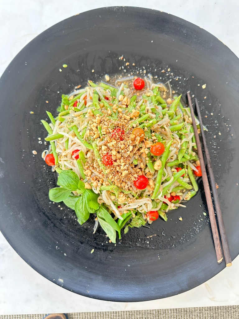 I had an abundance of long green beans in my garden. I also had tons of cherry tomatoes. This salad is a perfect way to showcase them. It has tangy and crisp Southeast Asian vibes.