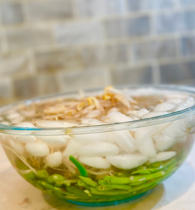 1. Blanch the green beans and sprouts. Bring a pot of salted water to a rolling boil. Add the trimmed green beans, cook ~2–3 minutes until bright green and just fork-tender (not mushy). Immediately drain and plunge into an ice bath (or rinse under very cold water) to stop cooking and retain crispness. Do the same for the sprouts but boil for just 1 minute.