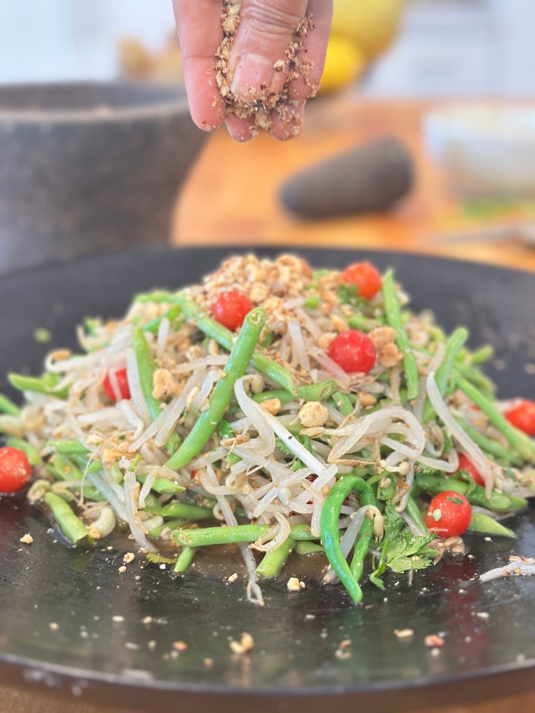 - Texture contrast: crisp-tender green beans, crunchy peanuts, and mung sprouts