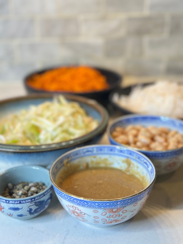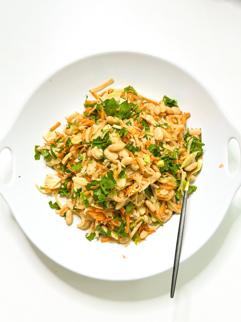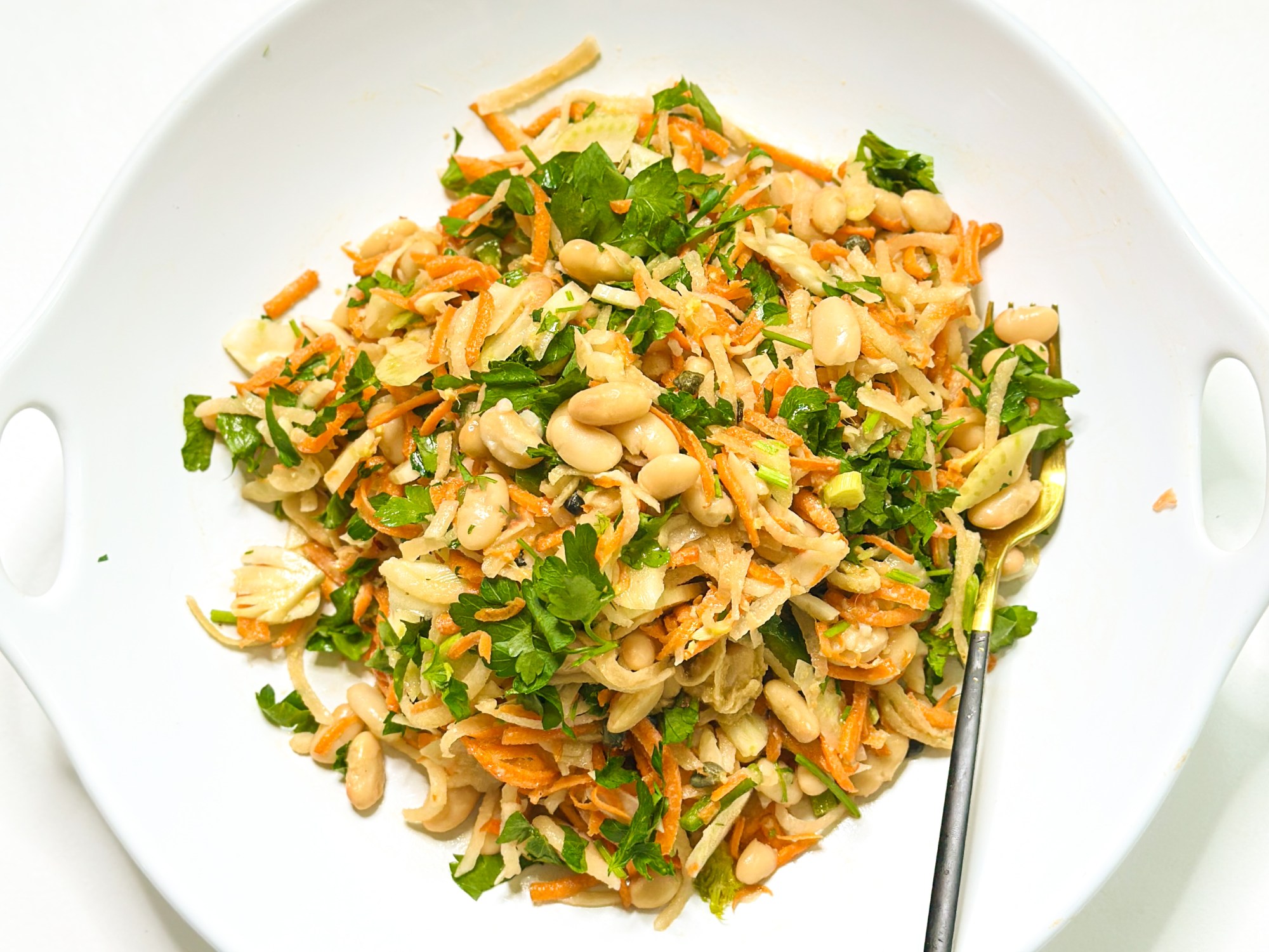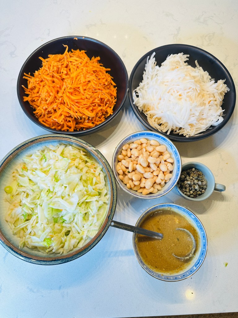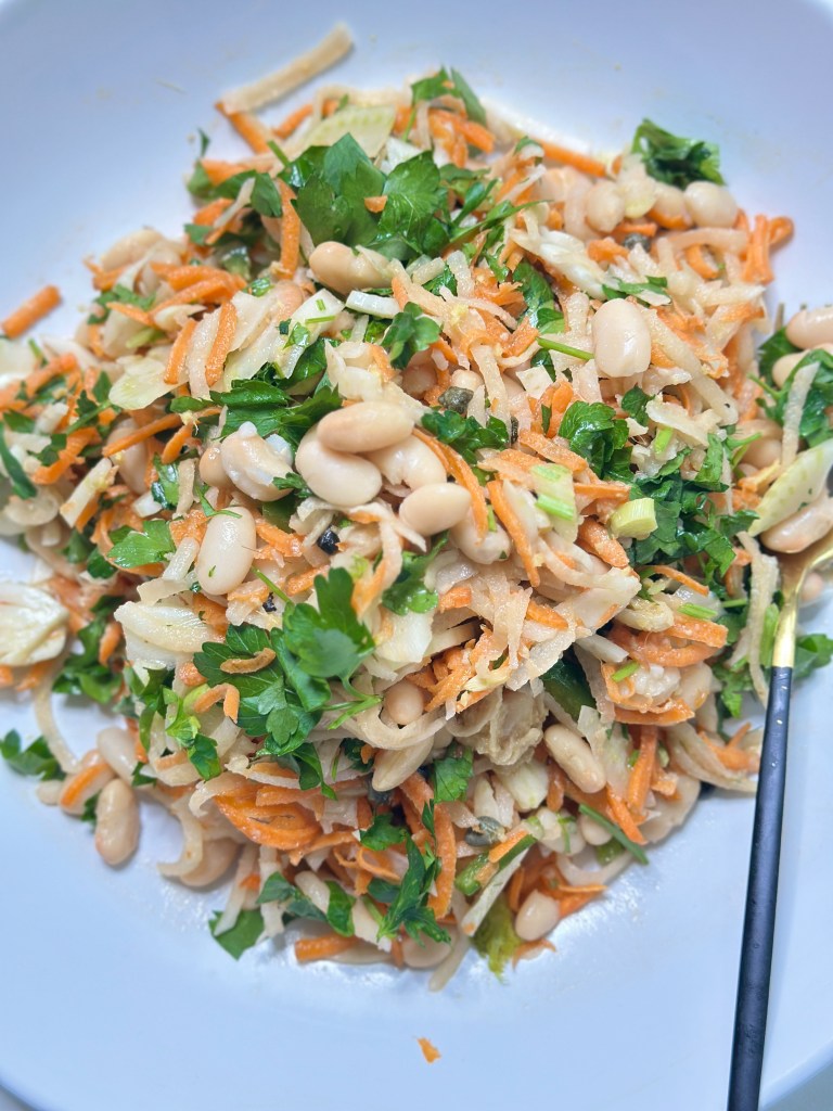 2. Prepare the salad: In a bowl, combine the shredded veggies and the beans