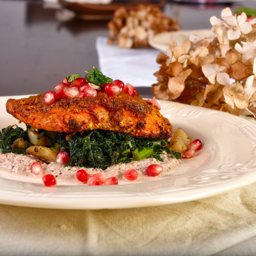 Tandoori Salmon with Pomegranate Walnut Chutney